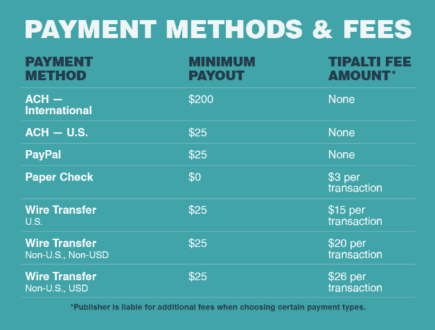 For most payment methods including wire transfer, ACH and paypal the minimum account payment balance is $25. International ACH require a minimum $200. Paypal and ACH do not have any fees, whereas wire transfers and checks do incur transactions fees.